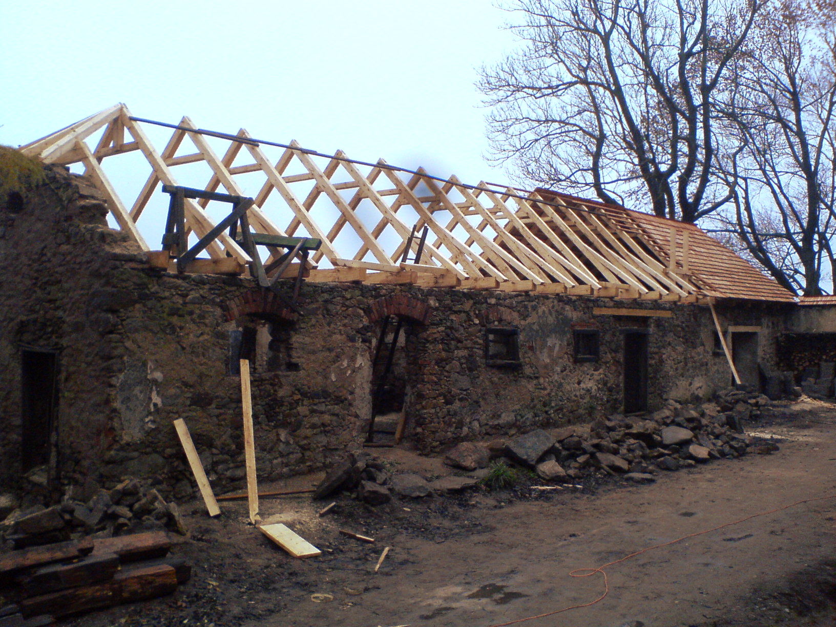 Bez předchozí konzultace objednal investor na výrobu repliky krovu řezané trámy. Pro co nejvěrnější napodobení vzhledu původního krovu jsem se rozhodl všechny mohutnější prvky (vazné trámy, krokve) přelícovat širočinou (s tím mi vydatně pomohl kolega Robert Malý z Českých Budějovic), menší prvky (hambalky, námětky) ohoblovat ručním hoblíkem (vše hoblovala Libuše Marková z Prahy).